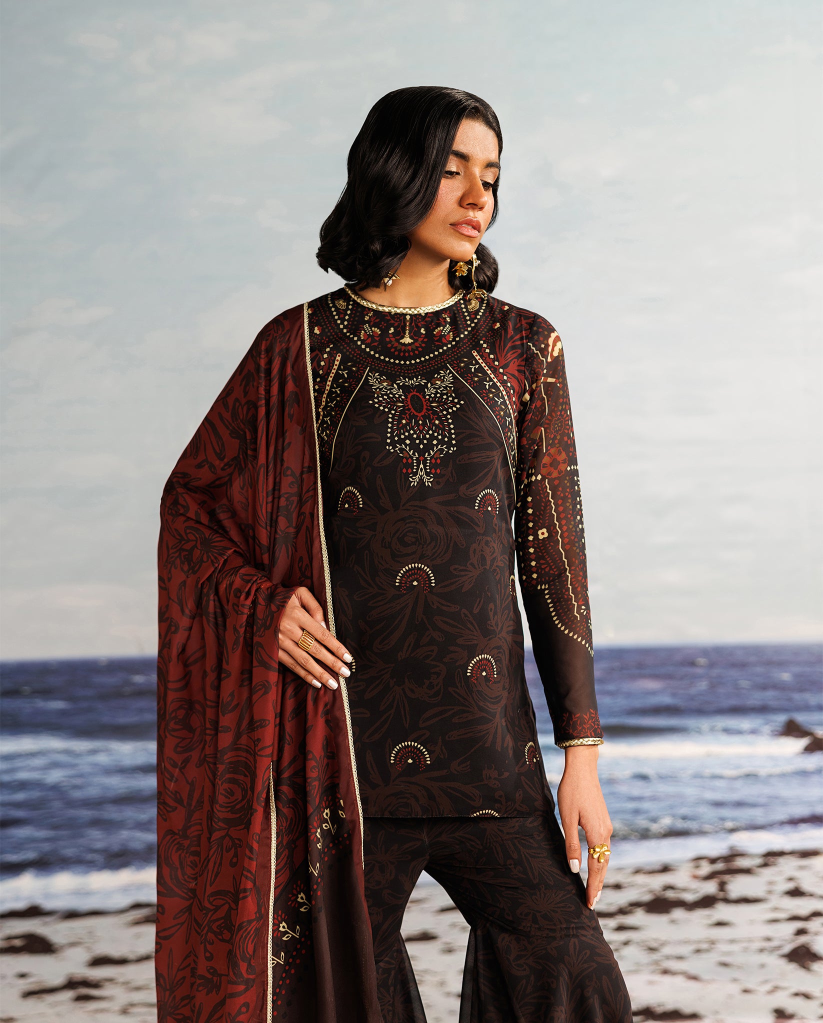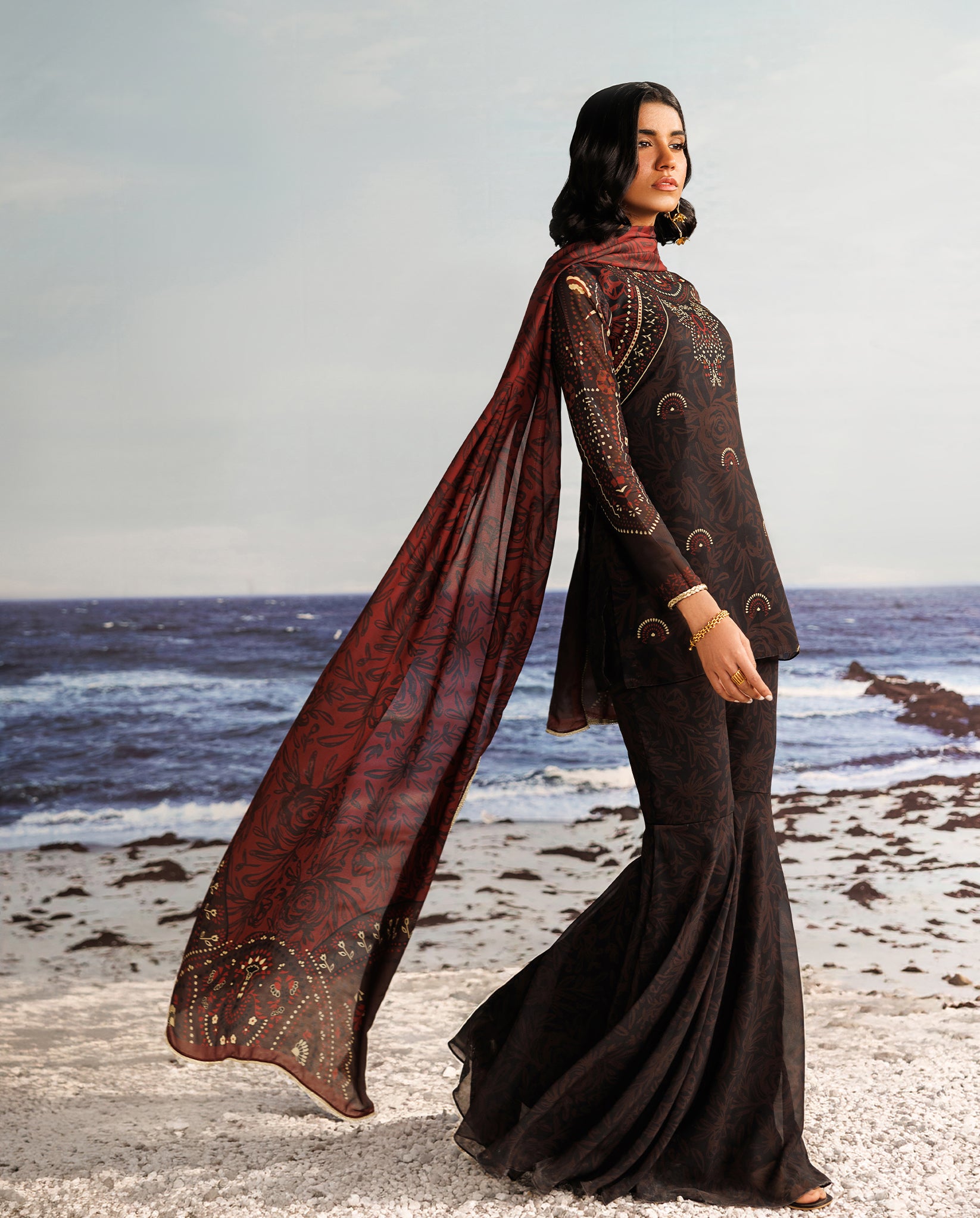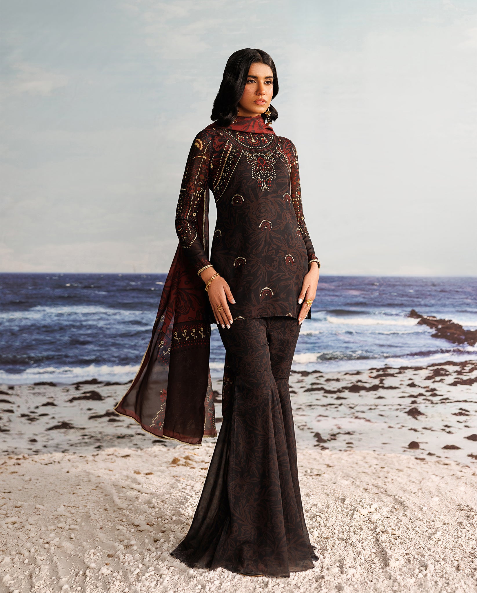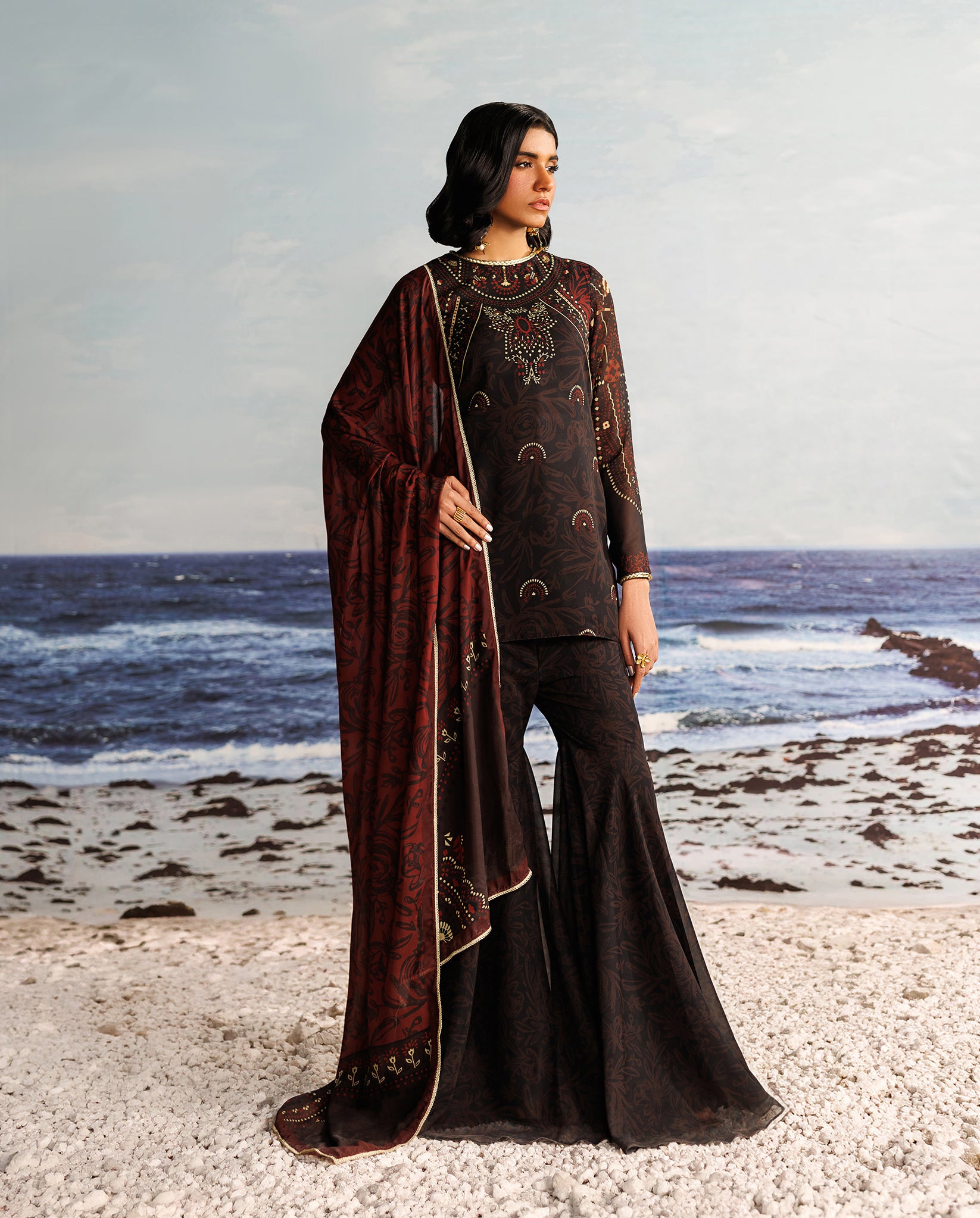 A black chiffon sharara set, elevated with a bold red contrasting dupatta and adorned with exquisite hand-braided tilla dori, bringing depth, texture, and understated elegance to the ensemble