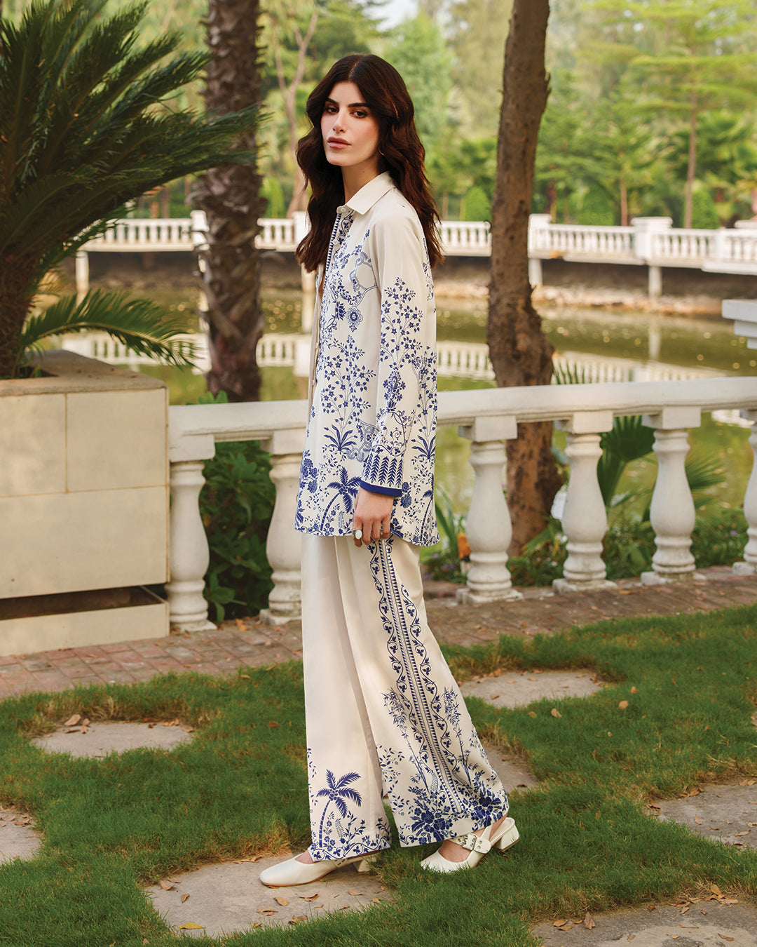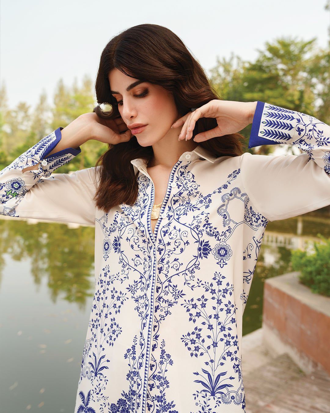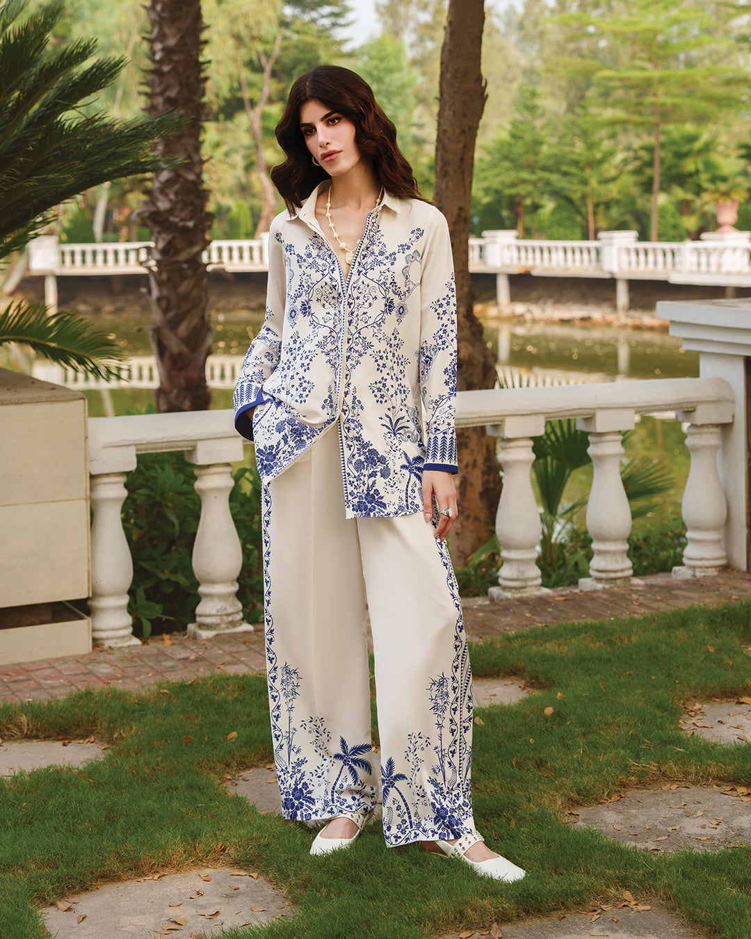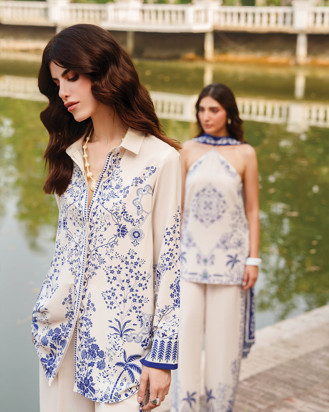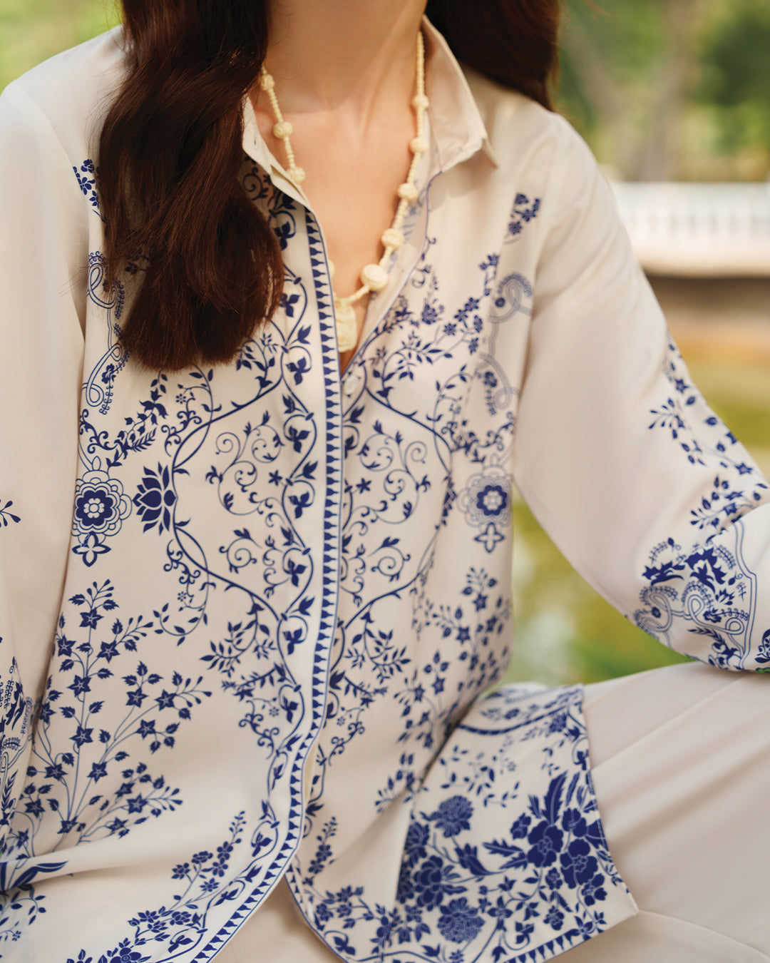Detail: This soft crepe co-ord set features a collared button-up shirt detailed with elegant double cuffs, paired with wide-legged trousers for a relaxed yet sophisticated silhouette. The classic color palette beautifully complements the intricate tile motifs, blending traditional patterns with a modern twist. A perfect fusion of heritage design and contemporary style