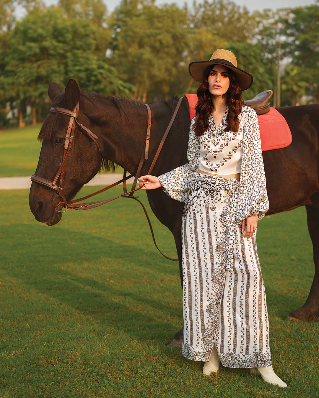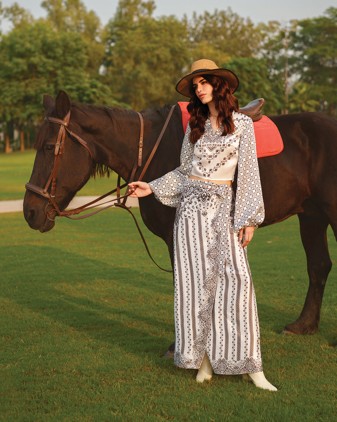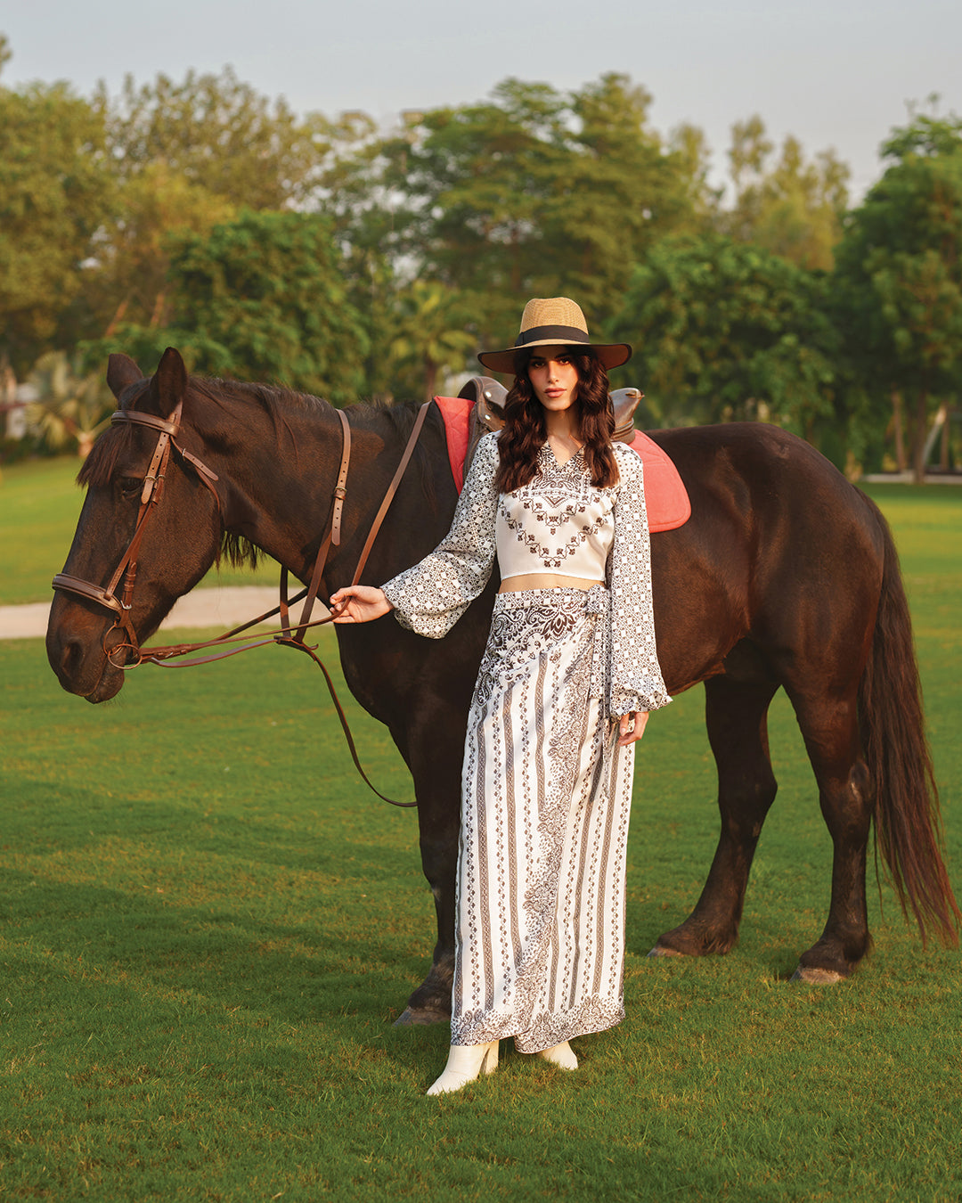 Detail: This chic ensemble features a luxurious silk wrap-around skirt paired with a matching silk top, designed with voluminous full sleeves for a bold yet feminine silhouette. The modern cut and fluid fabric give the outfit an effortlessly stylish edge, perfect for outdoor occasions and elevated everyday moments.