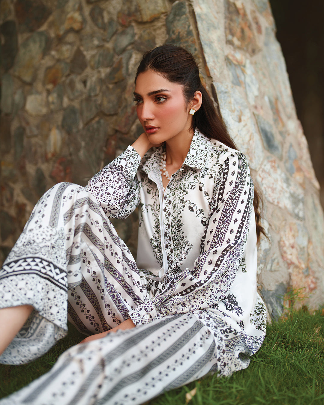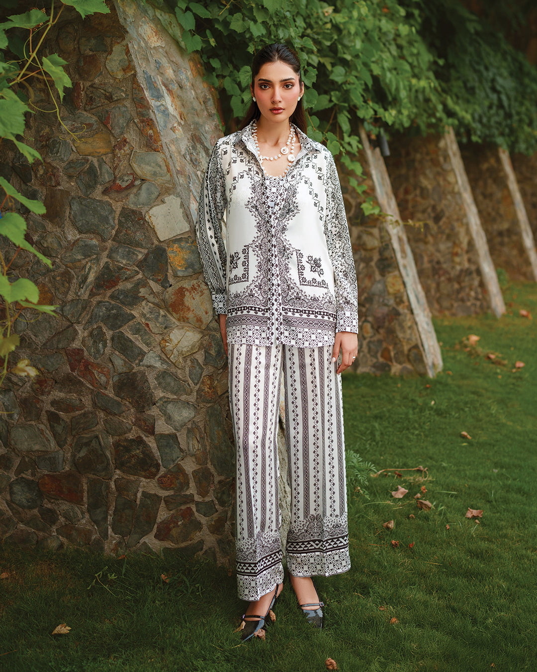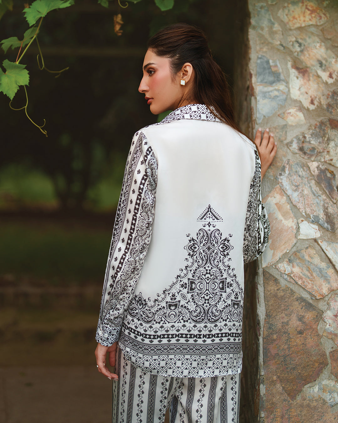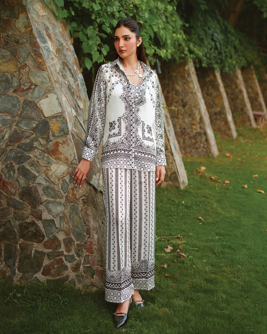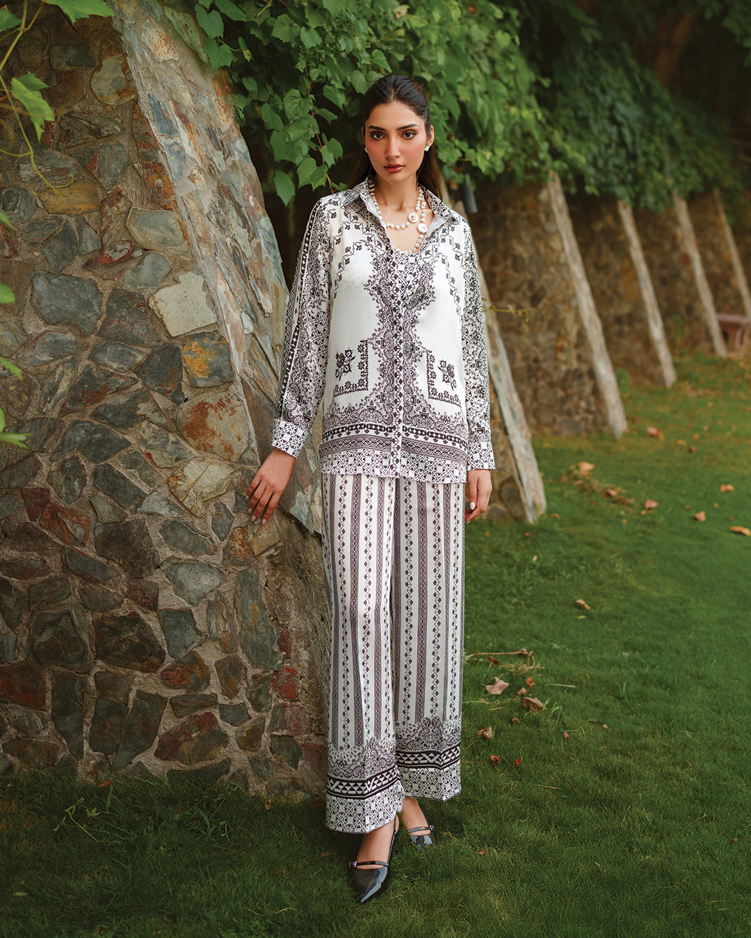 Detail: This elegant dress features a soft ivory base adorned with intricate black motifs, creating a timeless contrast. Designed with a button up shirt, loose-fit silhouette and wide legged trousers, it ensures effortless comfort while maintaining a refined aesthetic. Perfect for both relaxed gatherings and graceful occasions, this piece embodies understated elegance.